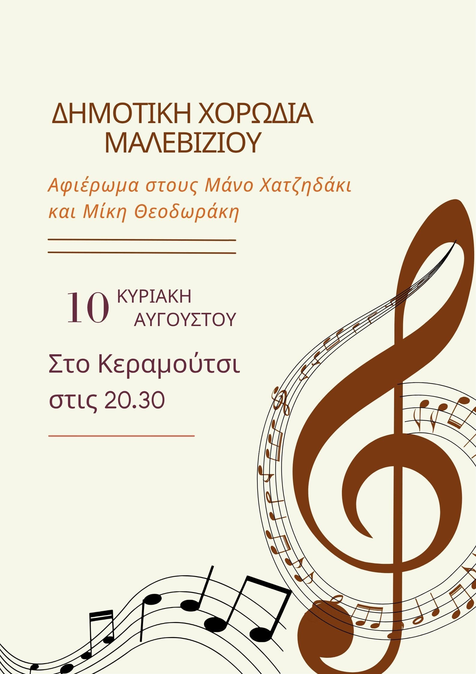 Η Δημοτική Χορωδία Μαλεβιζίου θα παρουσιάσει ένα μουσικό αφιέρωμα στους Μίκη Θεοδωράκη και Μάνο Χατζηδάκι στο Κεραμούτσι την Κυριακή 10 Αυγούστου στις 20.30.