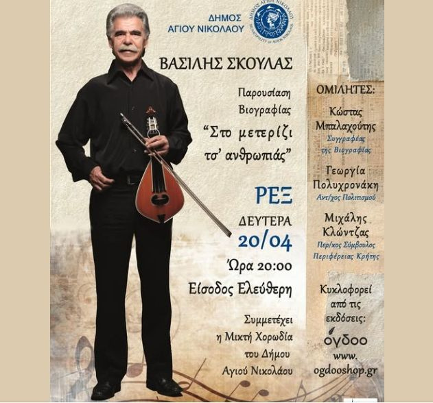 Ο Δήμος Αγίου Νικολάου και οι εκδόσεις Όγδοο παρουσιάζουν την Δευτέρα 20 Απριλίου στις 8 το βράδυ στο κινηματοθέατρο REX τη βιογραφία του Βασίλη Σκουλά με τίτλο «Στο μετερίζι τσ’ ανθρωπιάς».