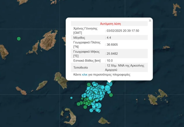 Νωρίτερα (22:11) καταγράφηκε σεισμός 4,1 Ρίχτερ με επίκεντρο 68,6 χιλιόμετρα βόρεια-δυτικά της Καρπάθου.