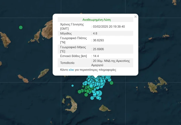 Το επίκεντρο της δόνησης ήταν 20 χιλιόμετρα νοτιοδυτικά της Αμοργού και το εστιακό βάθος στα 14,4 χλμ.