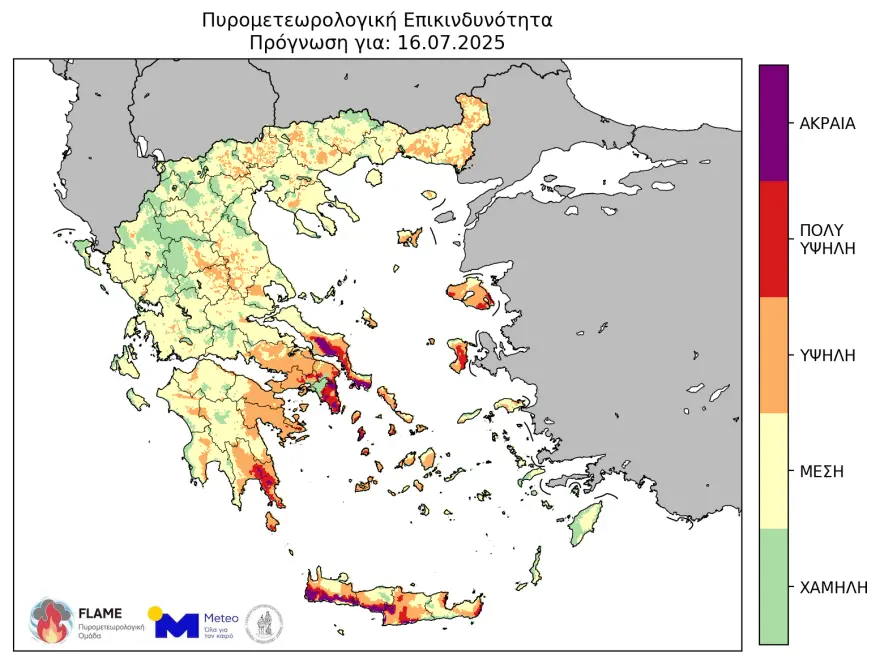 Σύμφωνα με τον χάρτη Πρόβλεψης Κινδύνου Πυρκαγιάς που εκδίδει η Γενική Γραμματεία Πολιτικής Προστασίας του υπουργείου Κλιματικής Κρίσης και Πολιτικής Προστασίας, για σήμερα 16 Ιουλίου , προβλέπεται πολύ υψηλός κίνδυνος πυρκαγιάς (κατηγορία κινδύνου 4) για τις εξής περιοχές: