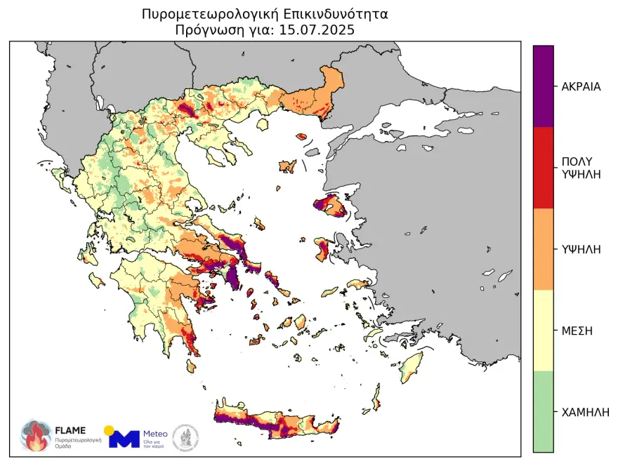 Σύμφωνα με τον Χάρτη Πρόβλεψης Κινδύνου Πυρκαγιάς που εκδίδει η Γενική Γραμματεία Πολιτικής Προστασίας του Υπουργείου Κλιματικής Κρίσης και Πολιτικής Προστασίας, για σήμερα Τρίτη 15 Ιουλίου 2025, προβλέπεται πολύ υψηλός κίνδυνος πυρκαγιάς (κατηγορία κινδύνου 4) για τις εξής περιοχές: