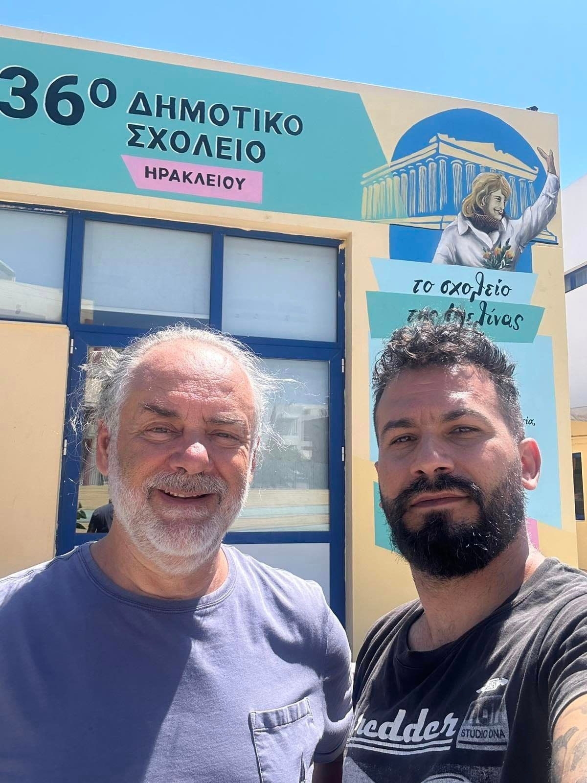 «Μετά την επίσημη μετονομασία του σχολείου μας ολοκληρώσαμε το πρώτο μέρος της εικαστικής παρέμβασης που σχεδιάζουμε. Ευχαριστούμε την κ. Χρηστάκη Μαρία, γραφιστρια, εκπαιδευτικό και πρώην μαμά του σχολείου μας, που σχεδίασε και προσέφερε το σχέδιο, τον ζωγράφο Χρήστο Μαρκάκη το σύλλογο γονέων που είναι πάντα κοντά μας ,τη σχολική επιτροπή του Δήμου Ηρακλείου και τον πρόεδρο της και αντιδήμαρχο Παιδείας Αντώνη Περισυνάκη για τη στήριξη τους. Προχωράμε»