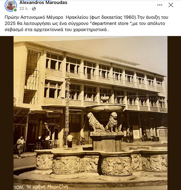 “Πρώην Αστυνομικό Μέγαρο Ηρακλείου (φωτ δεκαετίας 1960).Την άνοιξη του 2025 θα λειτουργήσει ως ένα σύγχρονο “department store “,με τον απόλυτο σεβασμό στα αρχιτεκτονικά του χαρακτηριστικά .” έγραψε ο ίδιος συνοδεύοντας το σχόλιο με την σχετική φωτογραφία.