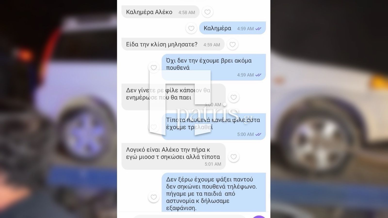 Σύμφωνα με τη στιχομυθία που δημοσιεύει το patris.gr ο 39χρονος εμφανίζεται να αγωνιά για το που βρίσκεται αλλά και να δηλώνει άγνοια για το τι της συνέβη.