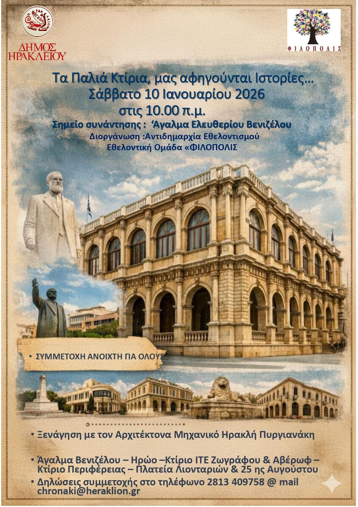 Η δράση είναι ανοιχτή σε όλους τους πολίτες που αγαπούν το Ηράκλειο, την ιστορία και την αρχιτεκτονική του και επιθυμούν να γνωρίσουν την πόλη μέσα από μια διαφορετική, βιωματική ματιά. Για δηλώσεις συμμετοχής και πληροφορίες, οι ενδιαφερόμενοι μπορούν να επικοινωνούν στο τηλέφωνο 2813 409758 ή στο mail [email protected]