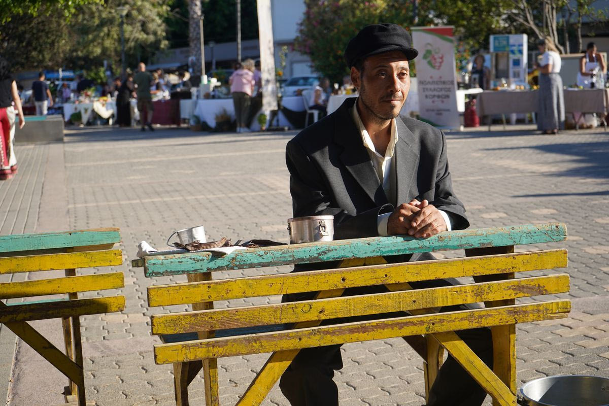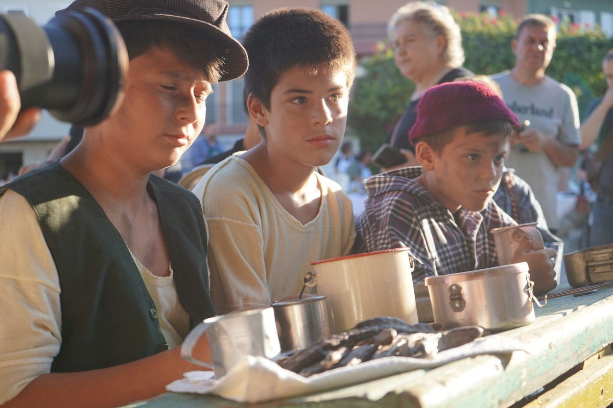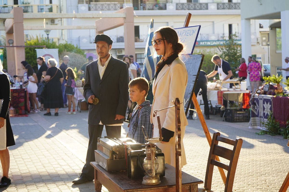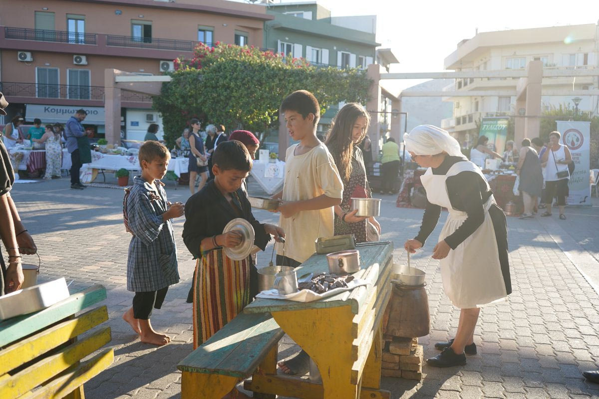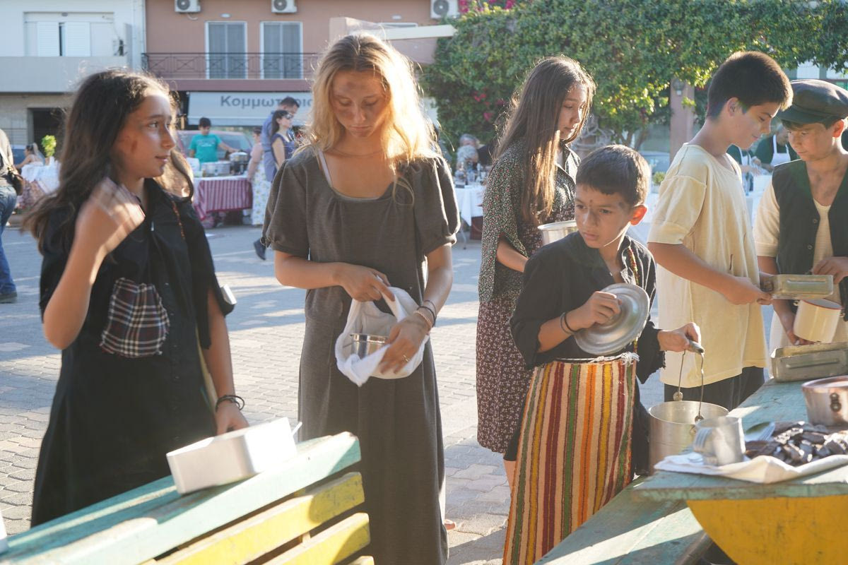 Σε μια γωνιά του φεστιβάλ, δεν υπήρχε απλώς ένας πάγκος με φαγητό. Υπήρχε ένας ζωντανός θεατρικός χώρος, ένα «κινητό ντοκιμαντέρ» που ξετύλιγε την πείνα, τη φτώχεια, την αξιοπρέπεια και την αλληλεγγύη της Κατοχής. Παιδιά με ξυπόλυτα πόδια, με σκισμένες κάλτσες και φτωχικά ρούχα, κάθονταν σε παλιά ξύλινα θρανία. Μια γυναίκα, αυστηρή αλλά στοργική, με ρούχα εποχής, ενσάρκωνε τη δασκάλα – εκείνη που εκτός από γράμματα μοίραζε και κουράγιο.