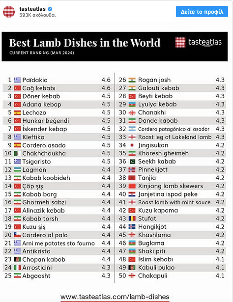 Η νέα λίστα του Taste Atlas αποτελείται από 142 πιάτα και τα ελληνικά είναι επτά, στο σύνολο: Παϊδάκια στην 1η θέση, κλέφτικο στην 8η θέση, τσιγαριστό στην 11η θέση, αρνί με πατάτες στον φούρνο στην 21η θέση, αντικριστό από την Κρήτη στην 22η θέση, μαούρι Καλύμνου στην 100η θέση και βυζάντι Καρπάθου στην 102η θέση.