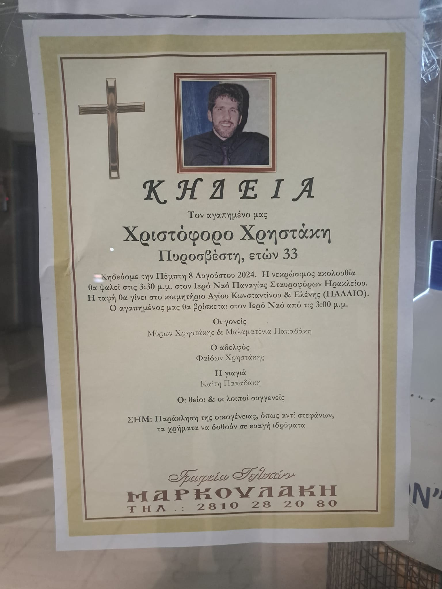 Η κηδεία του έγινε την Πέμπτη 8/8/24 και ώρα 15:30 στον ιερό ναό Παναγίας Σταυροφόρων δίπλα στο παλιό νοσοκομείο (Απολλώνιο), ενώ η ταφή στο κοιμητήριο του Αγίου Κωνσταντίνου.