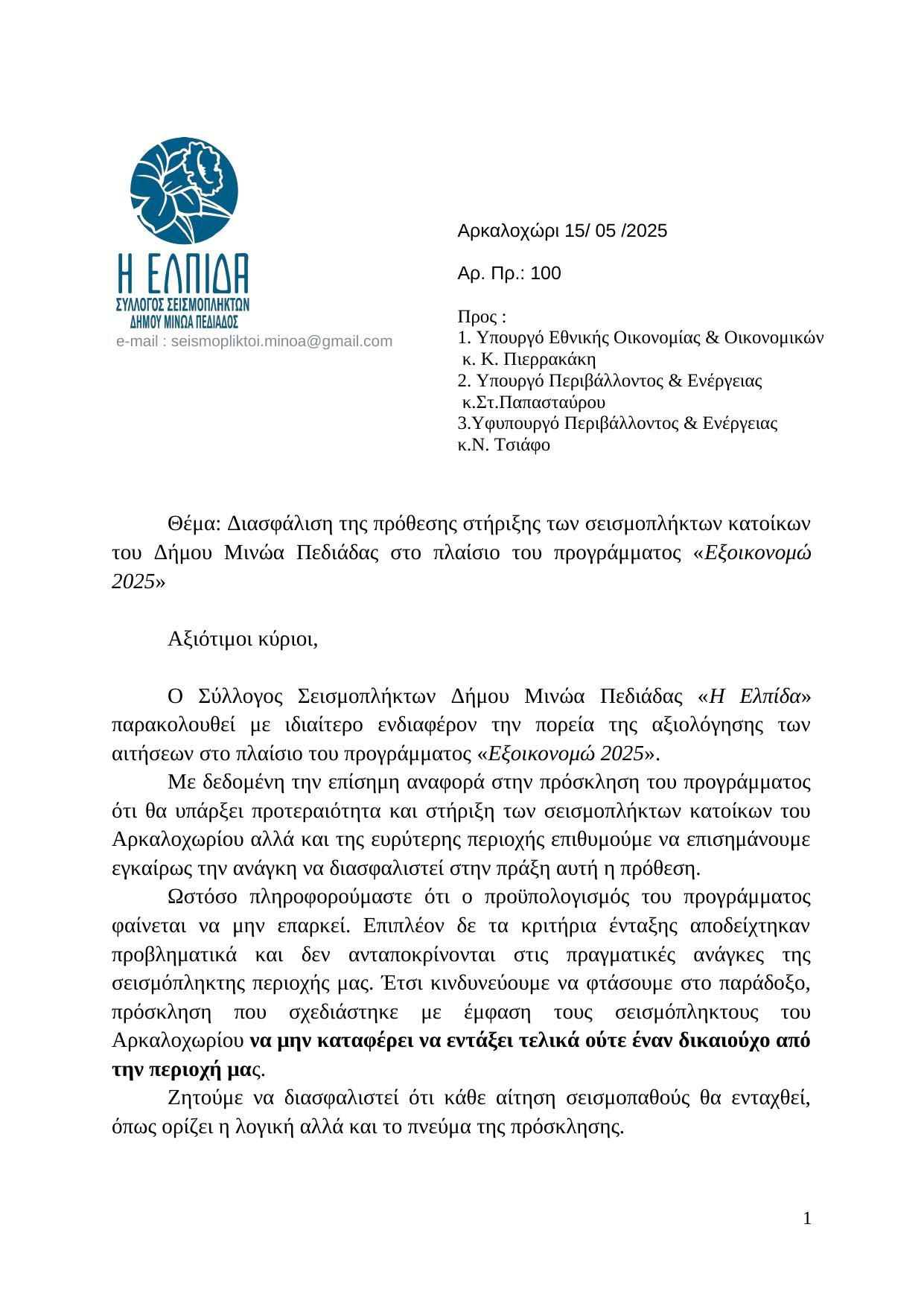 Ο Σύλλογος Σεισμοπλήκτων Δήμου Μινώα Πεδιάδας «Η Ελπίδα» παρακολουθεί με ιδιαίτερο ενδιαφέρον την πορεία της αξιολόγησης των αιτήσεων στο πλαίσιο του προγράμματος «Εξοικονομώ 2025».