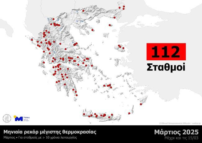 Οι πολύ υψηλές μέγιστες θερμοκρασίες που σημειώθηκαν τις τελευταίες 4 μέρες (12-15/03/2025) στη χώρα, αποτέλεσαν σε πολλές περιοχές τιμές ρεκόρ για το μήνα Μάρτιο.