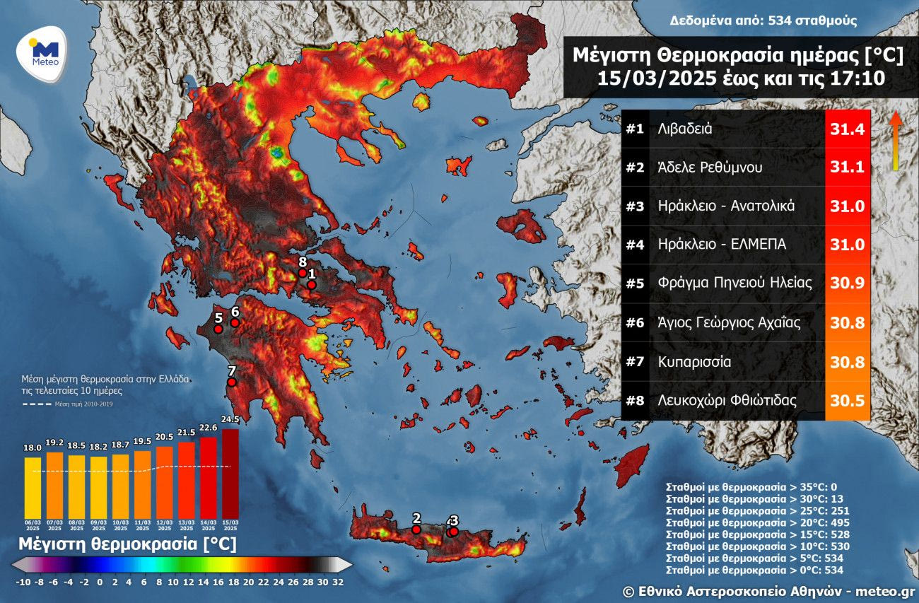 Εικόνα 1. Μέγιστες θερμοκρασίες έως τις 17:00 του Σαββάτου 15/03, και οι 8 υψηλότερες μέγιστες τιμές από 534 μετεωρολογικούς σταθμούς του δικτύου αυτόματων μετεωρολογικών σταθμών του meteo.gr / Εθνικού Αστεροσκοπείου Αθηνών.