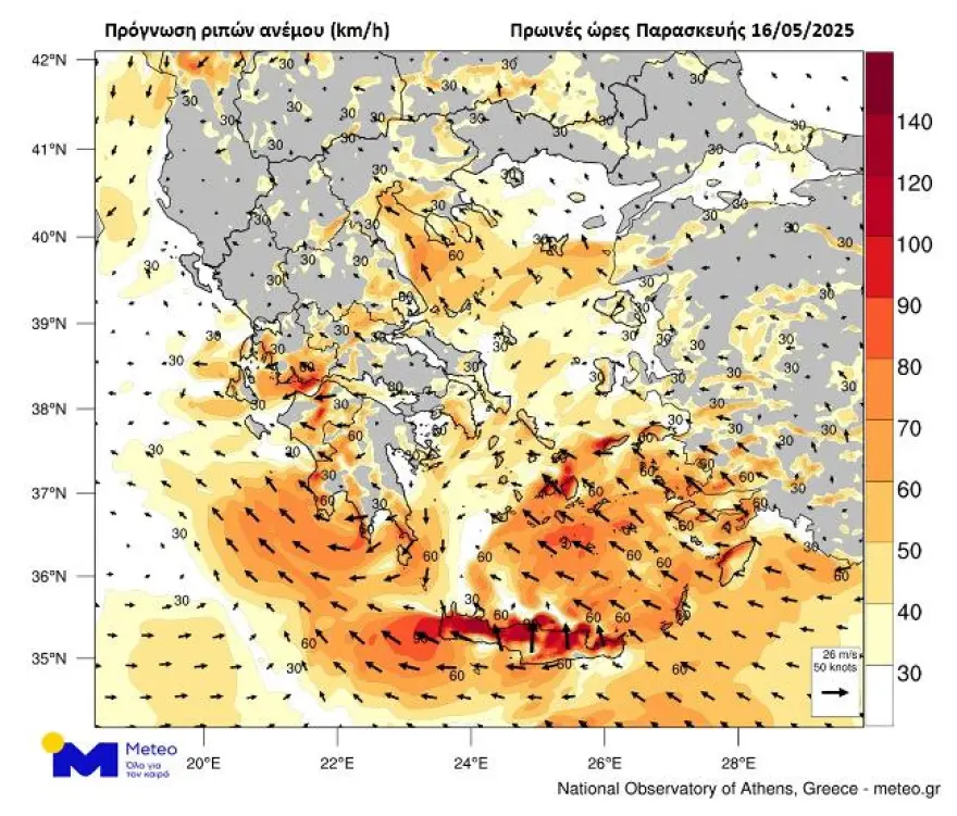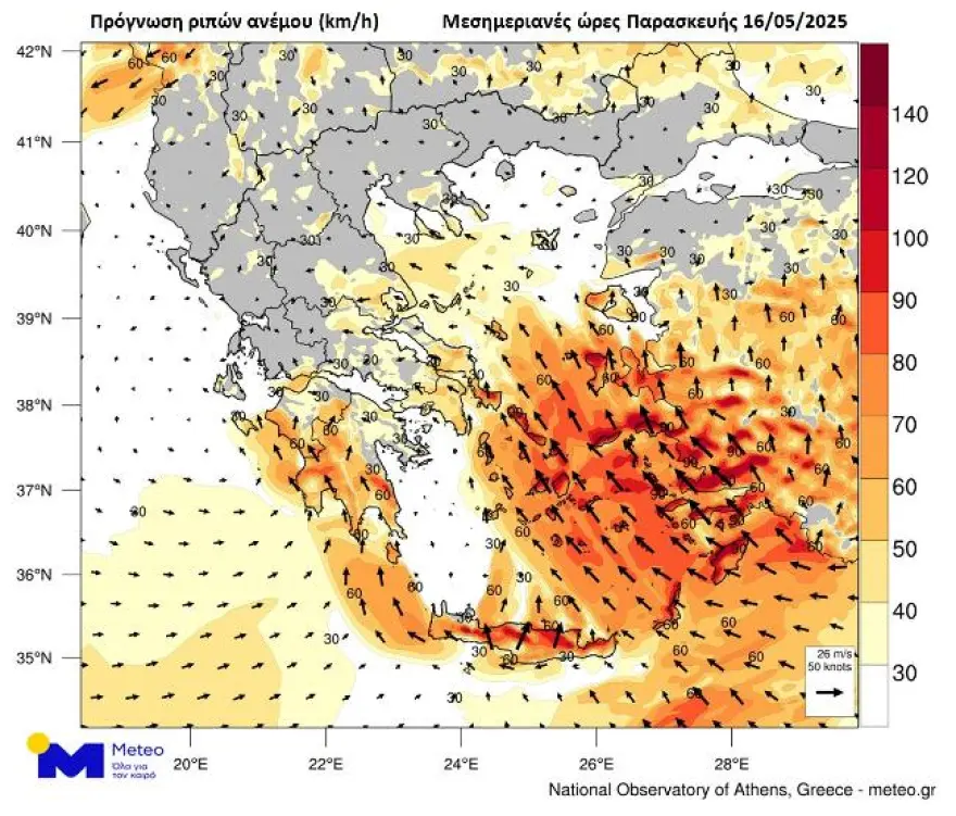 Β. Τοπικά θυελλώδεις νοτιοανατολικοί άνεμοι (8 με ριπές 9 μποφόρ) την Παρασκευή (16-05-25) στο Αιγαίο και την Κρήτη και μέχρι το μεσημέρι στο νότιο Ιόνιο και τη νότια Πελοπόννησο.