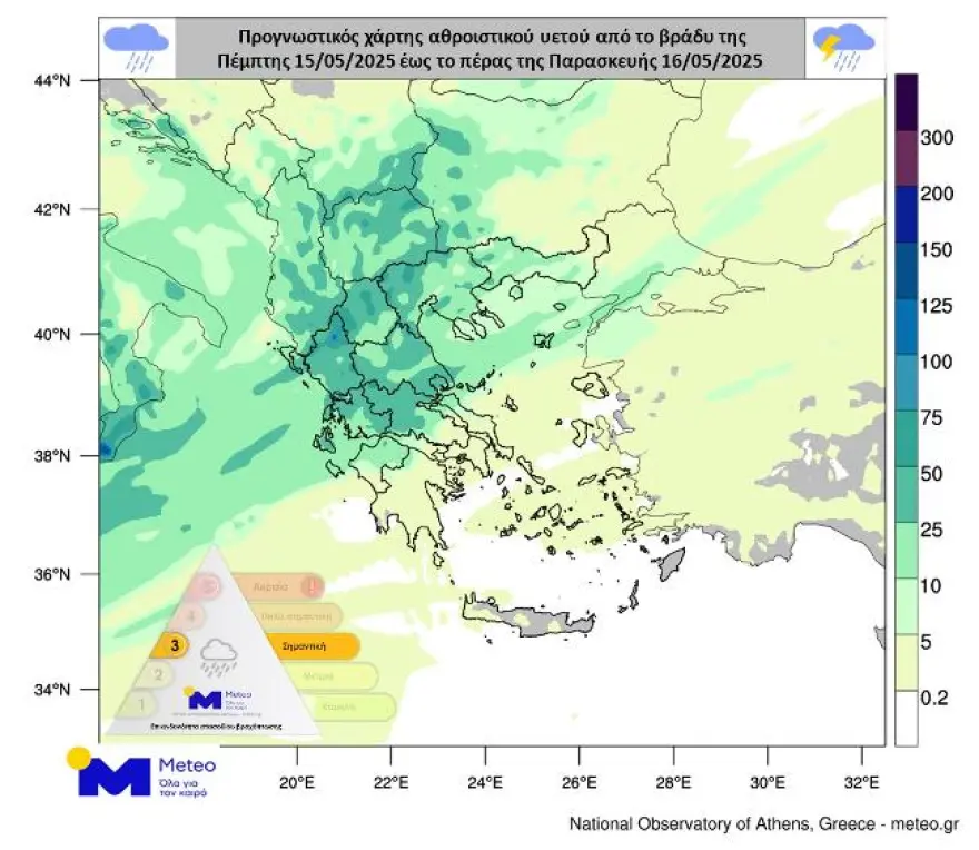 3. από το απόγευμα της Παρασκευής (16-05-25) και έως και το πρωί του Σαββάτου (17-05-25) στην ανατολική Μακεδονία, τη Θράκη και στο βορειοανατολικό Αιγαίο (περιοχή Λήμνου).