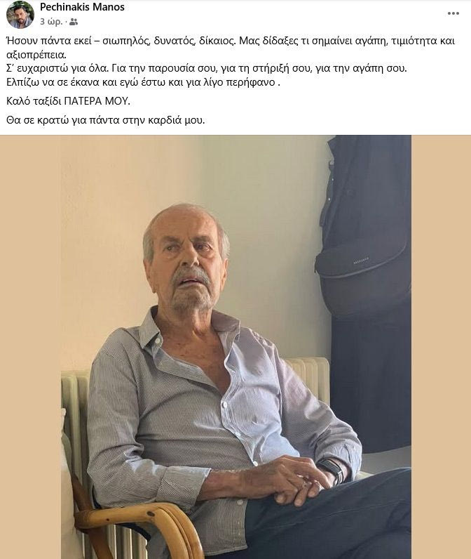 «Ήσουν πάντα εκεί – σιωπηλός, δυνατός, δίκαιος. Μας δίδαξες τι σημαίνει αγάπη, τιμιότητα και αξιοπρέπεια», έγραψε στον προσωπικό του λογαριασμό στο facebook, ο γιος του Μάνος Πεχυνάκης.
