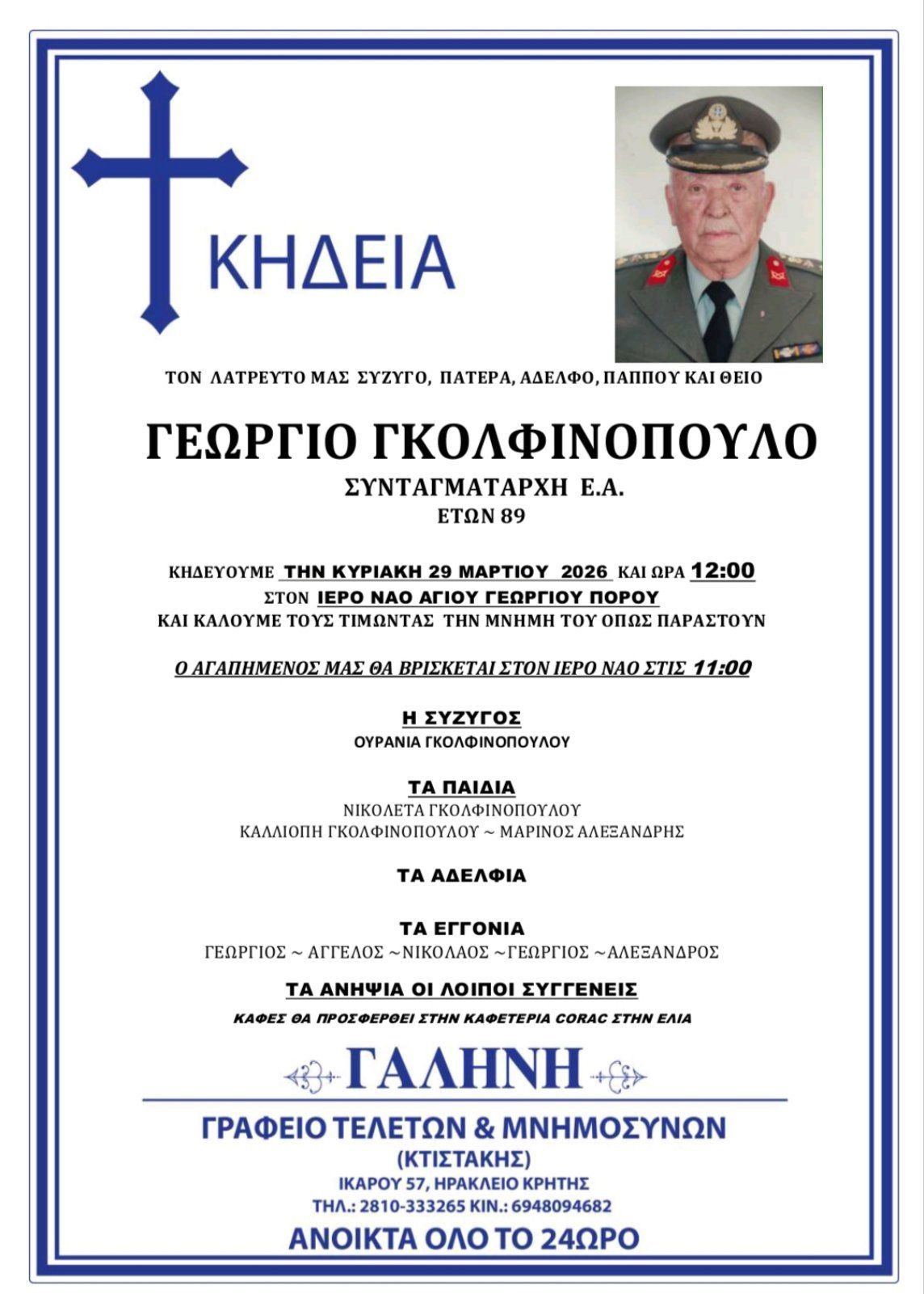 Θλίψη στην κοινωνία του Ηρακλείου από το θάνατο του συνταγματάρχης ε.α. Γεωργίου Γκολφινόπουλου, ο οποίος έφυγε από τη ζωή σε ηλικία 89 ετών.