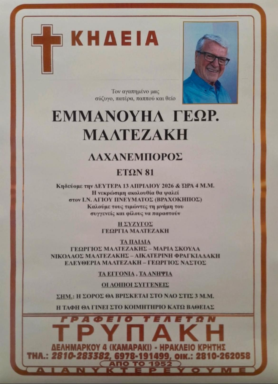Στο πένθος έχει βυθιστεί η τοπική κοινωνία του Ηρακλείου από το θανάτου του γνωστου λαχανέμπορα Εμμανουήλ Μαλτεζάκη που έφυγε από την ζωή σε ηλικία 81 ετών.