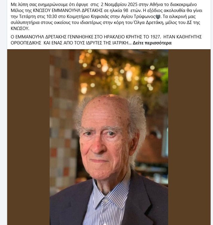 Θλίψη στο Ηράκλειο από το θάνατο του Μανώλη Δρετάκη σε ηλικία 98 ετών.