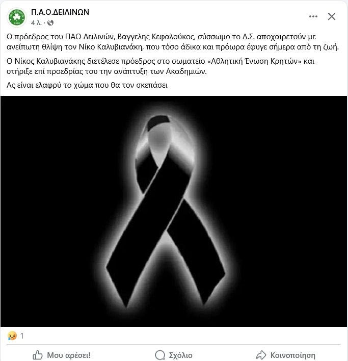 Η Ένωση Ποδοσφαιρικών Σωματείων Ηρακλείου, σύσσωμο το Δ.Σ. και όλη η οικογένεια του ηρακλειώτικου ποδοσφαίρου, αποχαιρετούν με ανείπωτη θλίψη τον Νίκο Καλυβιανάκη, που τόσο άδικα και πρόωρα έφυγε σήμερα από τη ζωή.