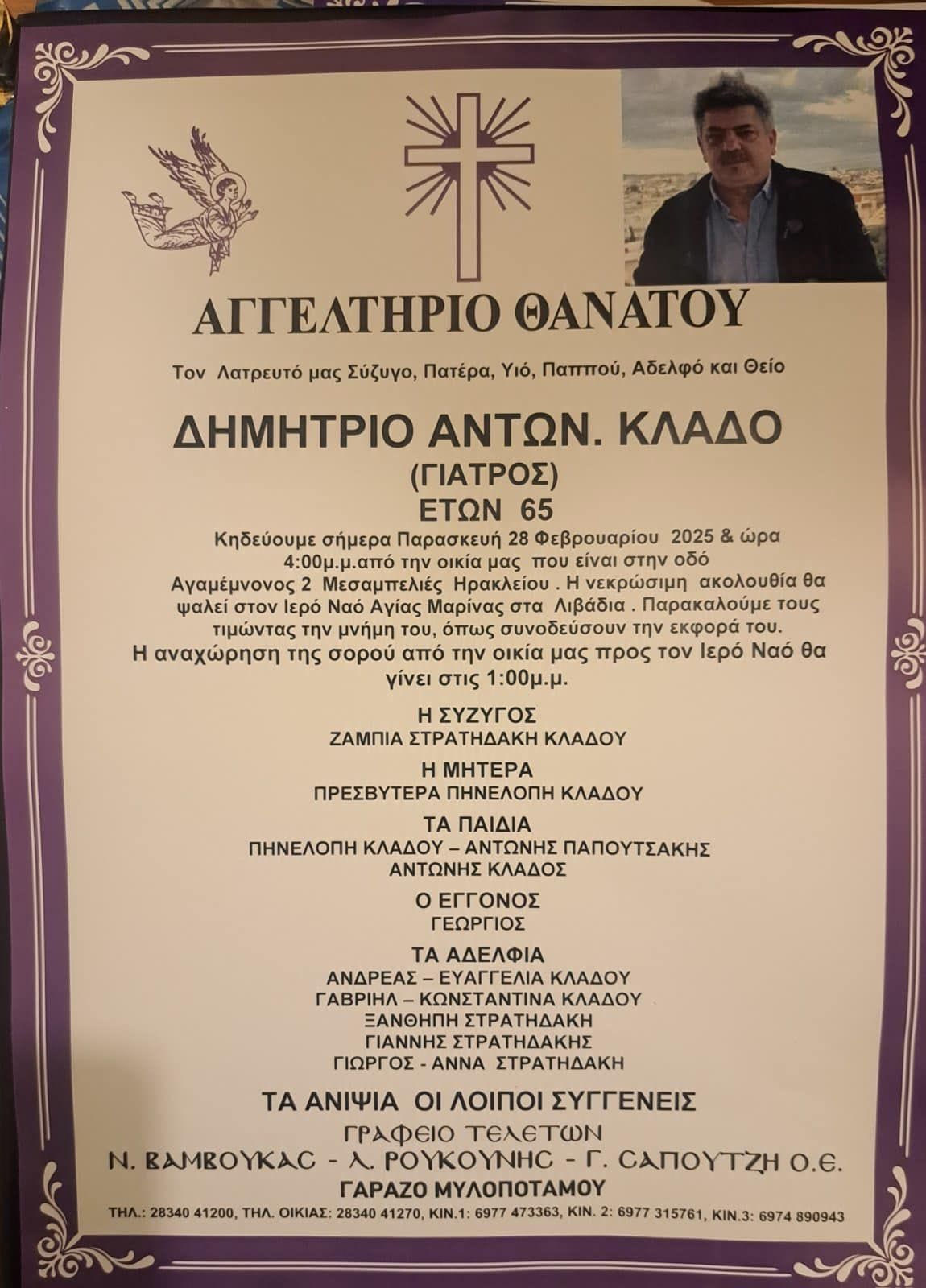 Σου υπόσχομαι ότι πάντα θα μιλάμε στους νέους γιατρούς για τον Δημήτρη Κλάδο, έναν από τους καλύτερους Διευθυντές της ΠΦΥ στην Κρήτη μας, μα κυρίως έναν καλό Άνθρωπο που αγαπούσε και νοιαζόταν πραγματικά για τον συνάδελφο, για τον ασθενή. Τον γιατρό Δημήτρη Κλάδο που τίμησε τον όρκο του.»