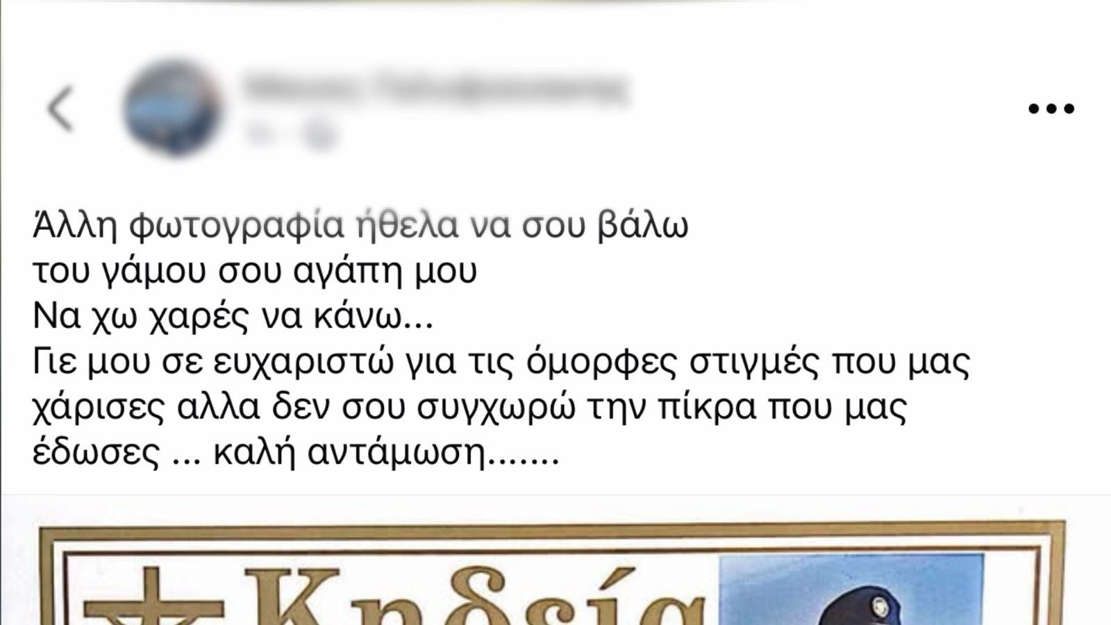 Συγκεκριμένα γράφει: «Άλλη φωτογραφία ήθελα να σου βάλω, του γάμου σου αγάπη μου, να χω χαρές να κάνω… Γιε μου, σε ευχαριστώ για τις όμορφες στιγμές που μας χάρισες, αλλά δεν σου συγχωρώ την πίκρα που μας έδωσες… Καλή αντάμωση…».