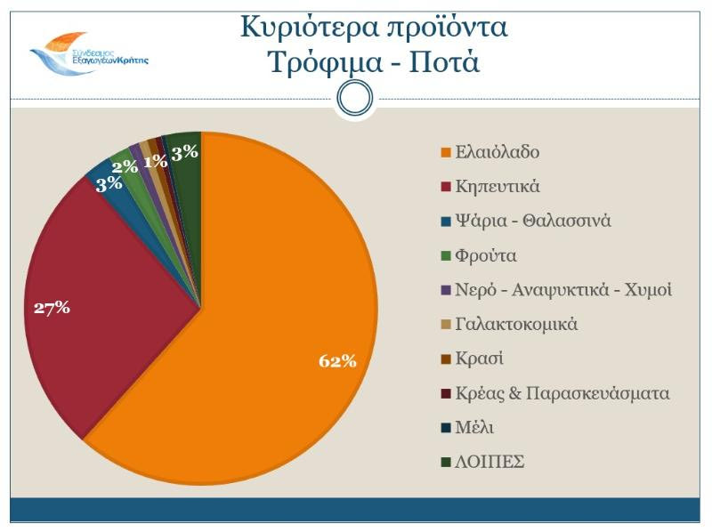 Στον αγροδιατροφικό τομέα, το Ελαιόλαδο έφτασε οριακά τα 96,3 εκ. ευρώ, καταλαμβάνοντας το 61,7% στην κατηγορία των Τροφίμων & Ποτών, με μείωση 63,2% σε αξία και 77,4% σε ποσότητα, σε σχέση με το περυσινό αντίστοιχο διάστημα. Τα Κηπευτικά έφτασαν τα 42,1 εκ. ευρώ με μείωση 21,8%, τα Ψάρια & Θαλασσινά τα 4,2 εκ. ευρώ και αύξηση 13,5%, τα Φρούτα τα 3 εκ. ευρώ και μείωση 11,8% και με μικρότερα ποσοστά ακολουθούν η κατηγορία των Νερών – Αναψυκτικών – Χυμών, τα Γαλακτοκομικά, το Κρασί, το Κρέας & Παρασκευάσματά του και το Μέλι.