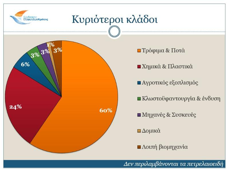 Ο κλάδος των Τροφίμων και Ποτών, ο οποίος αποτελεί το 59,5% του συνόλου των Κρητικών εξαγωγών με 156,1 εκ. ευρώ, παρουσιάζει μείωση ίση με 53,5%. Ο κλάδος των Χημικών & Πλαστικών έρχεται δεύτερος, με μερίδιο περίπου 24,4% επί του συνόλου των εξαγωγών της Κρήτης και αύξηση της τάξεως του 4,2%.