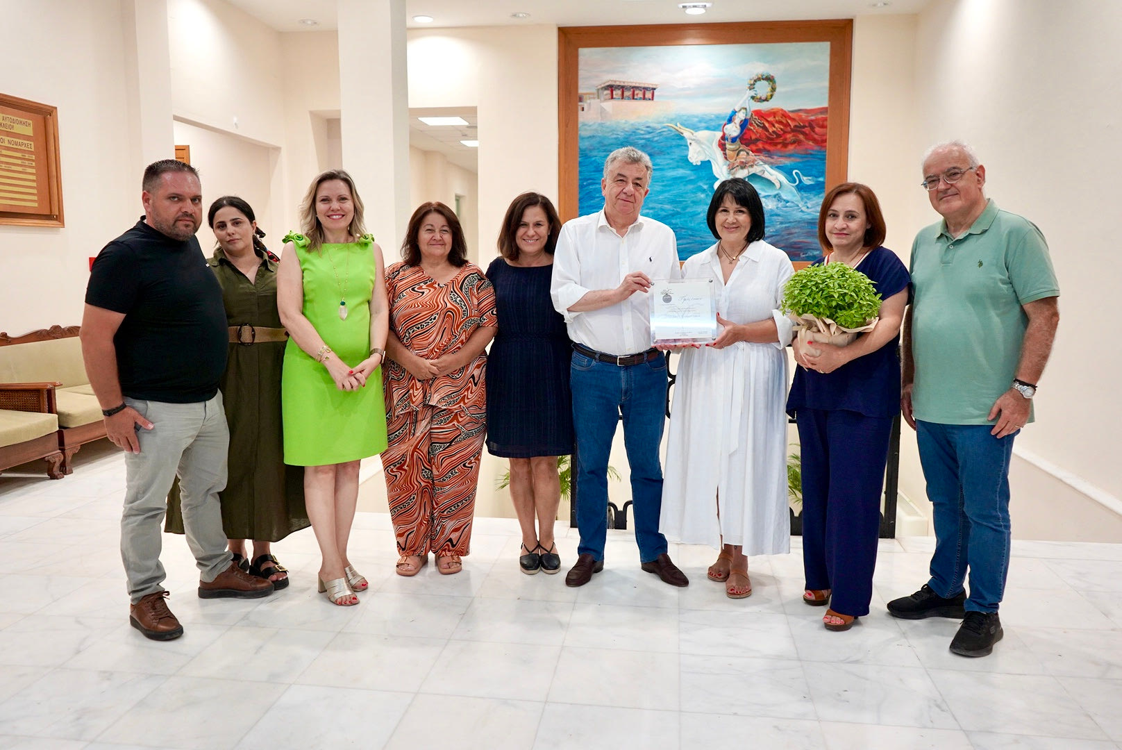 Τιμητική πλακέτα παρέδωσε σήμερα η Πρόεδρος του Φεστιβάλ Κρητικής Κουζίνας Λένα Ηγουμενάκη στον Περιφερειάρχη Κρήτης Σταύρο Αρναουτάκη για την διαχρονική και διαρκή προσφορά του στην προώθηση του κρητικού διατροφικού προτύπου.