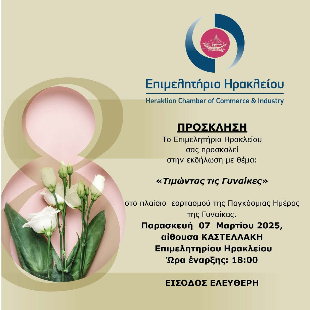 Το Επιμελητήριο Ηρακλείου πραγματοποιεί την εκδήλωση με θέμα: «Τιμώντας τις Γυναίκες» στο πλαίσιο εορτασμού της Παγκόσμιας Ημέρας της Γυναίκας.