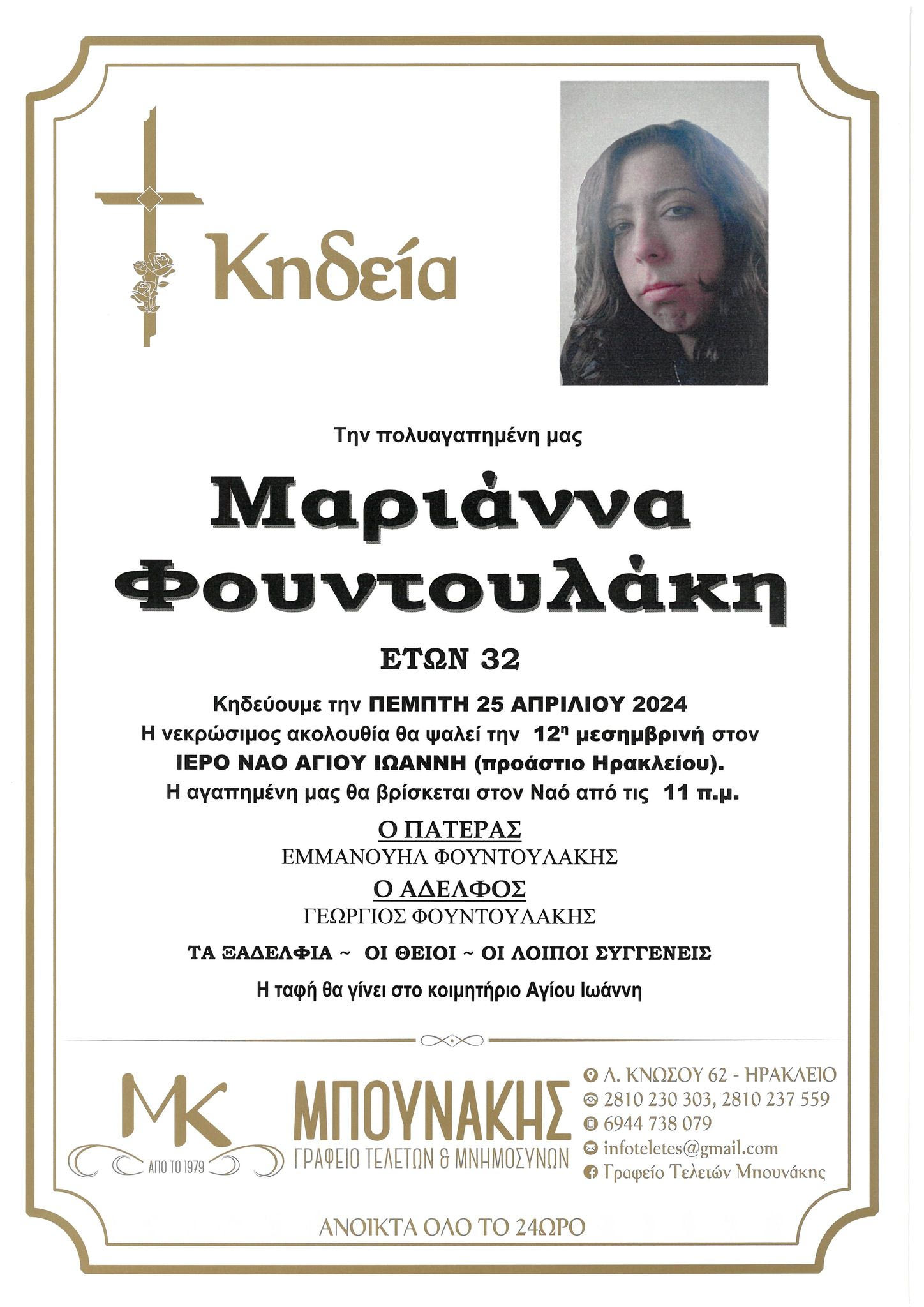 Την Μαριάννα Φουντουλάκη θα αποχαιρετήσουν αύριο (Πέμπτη), συγγενείς και φίλοι, η νεκρώσιμος ακολουθία θα ψαλεί στις 12.00 στον Ιερό Ναό του Αγίου Ιωάννη.