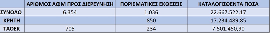 Αναλυτικά, «κατά το διάστημα από 8/7/2025 έως 31/8/2025 από το σύνολο της διαθέσιμης δύναμης της Υπηρεσίας μας ελέγχθησαν διεξοδικά 705 ΑΦΜ, εκ των οποίων εντοπίστηκαν 312 θετικά αποτελέσματα με τα ως κάτωθι δεδομένα».
