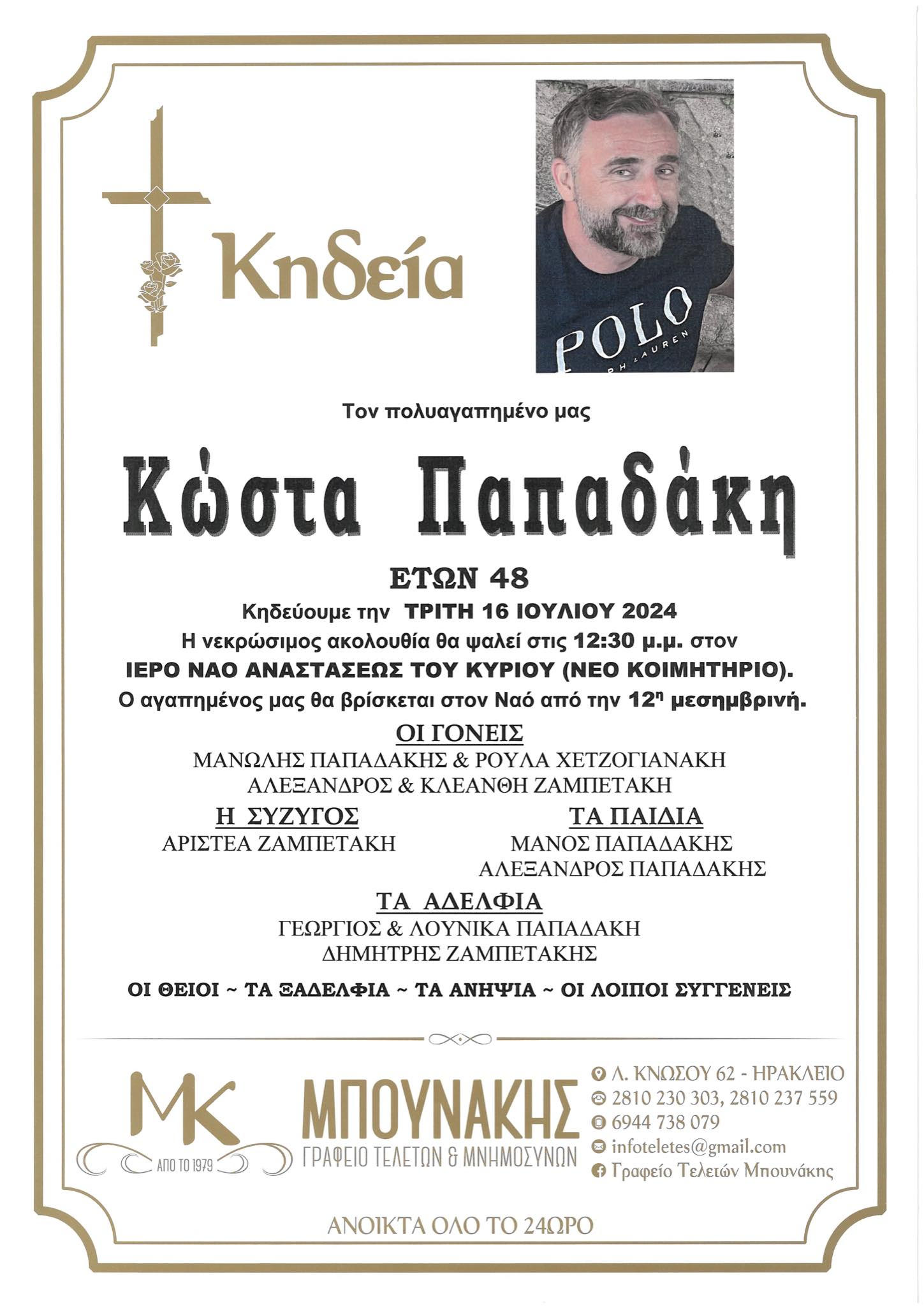 Σε ηλικία 48 ετών έφυγε από την ζωή ο Κώστας Παπαδάκης ,πατέρας 2 παιδιών, ο οποίος υπέστη ξαφνικά έμφραγμα