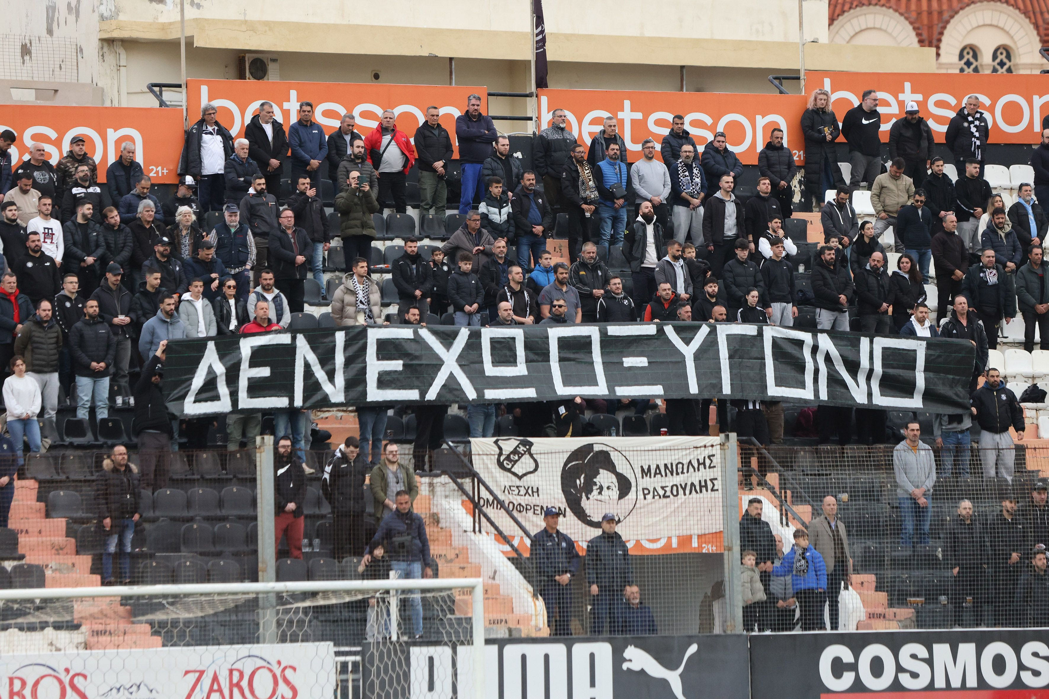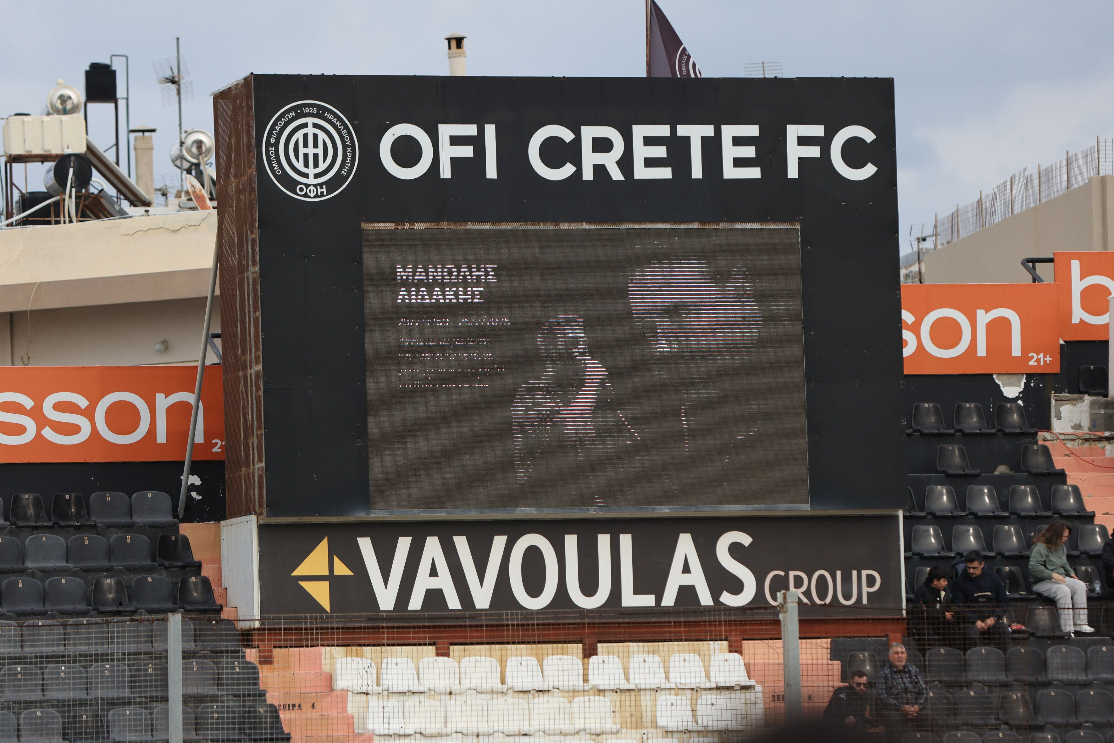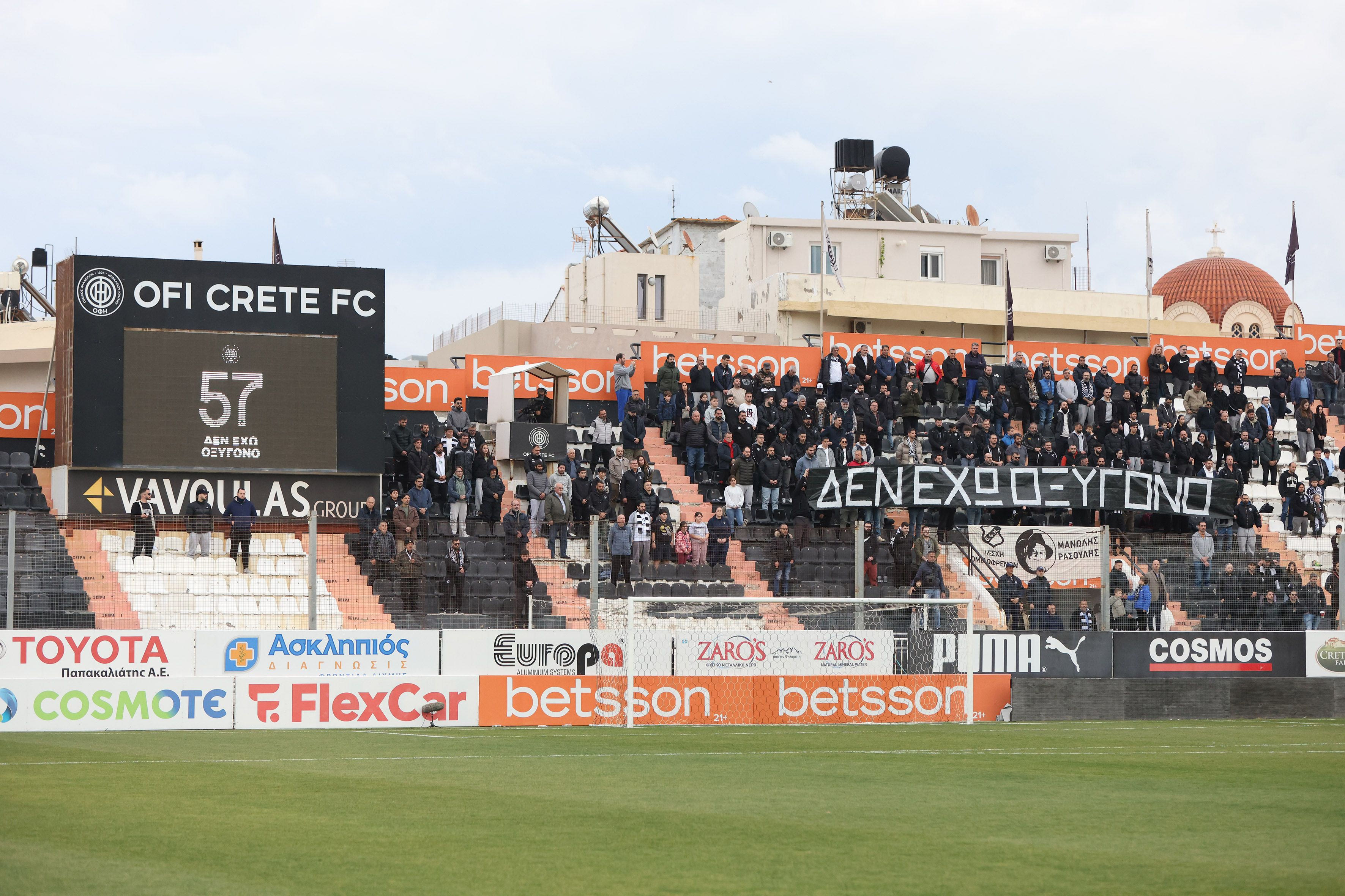 Οι φίλαθλοι του ΟΦΗ που βρέθηκαν στο Γεντί Κουλέ για να παρακολουθήσουν την αναμέτρηση της Ηρακλειώτικης ομάδας με την Λαμία δε θα μπορούσαν να μην αναφερθούν στον Μανώλη Λιδάκη αλλά και στο θάνατο των 57 συνανθρώπων μας στο σιδηροδρομικό δυστύχημα των Τεμπών.