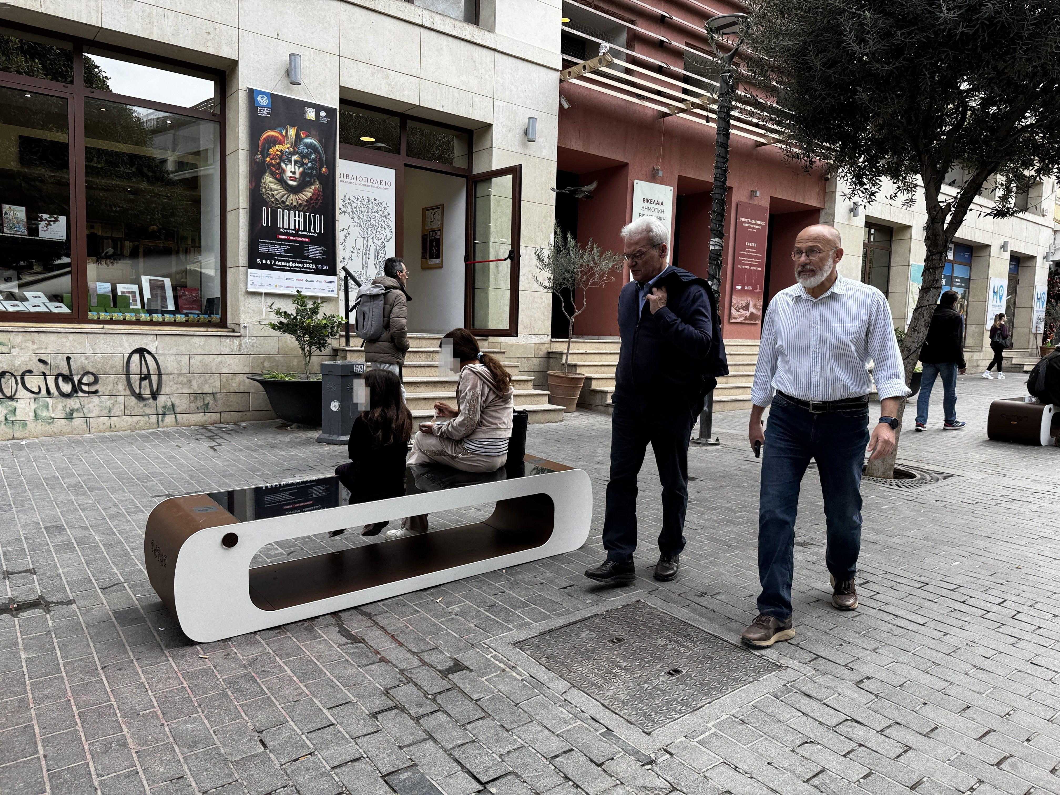Μερικά από τα νέα έξυπνα ηλιακά παγκάκια που έχουν εγκατασταθεί στο Ηράκλειο είδε από κοντά ο Δήμαρχος Ηρακλείου Αλέξης Καλοκαιρινός μαζί με τον Αντιδήμαρχο Αναπτυξιακού Προγραμματισμού & Ψηφιακού Μετασχηματισμού Τάσο Τσατσάκη το πρωί της Τετάρτης 3/12.