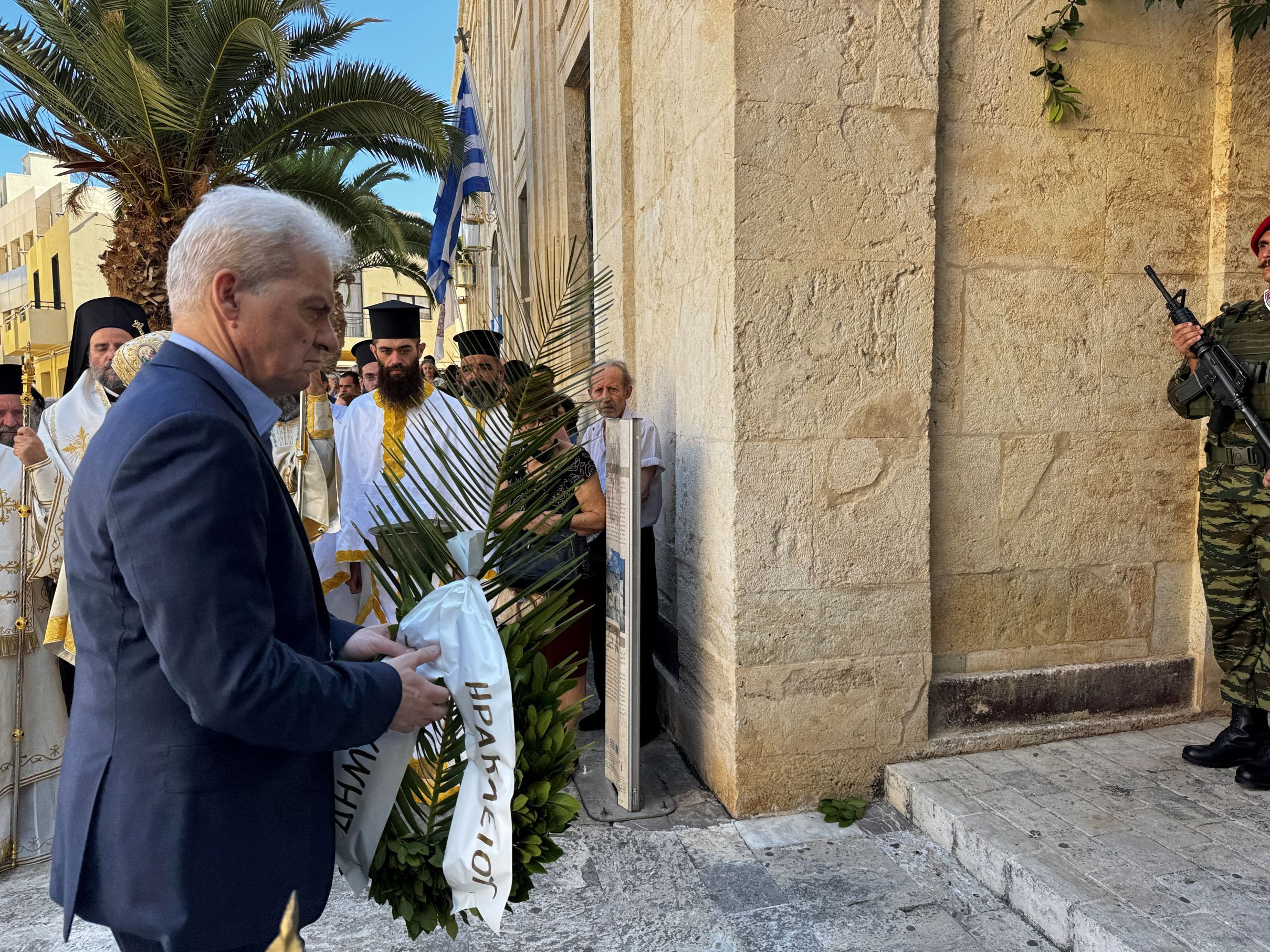 Ακολούθησε κατάθεση στεφάνων από τον Δήμαρχο Ηρακλείου Αλέξη Καλοκαιρινό, τον Περιφερειάρχη Κρήτης Σταύρο Αρναουτάκη, τους Βουλευτές Ηρακλείου Λευτέρη Αυγενάκη, Κωνσταντίνο Κεφαλογιάννη, Μάξιμο Σενετάκη, Ελένη Βατσινά, Φραγκίσκο Παρασύρη και Χάρη Μαμουλάκη, εκπροσώπους των Ενόπλων Δυνάμεων, των Σωμάτων Ασφαλείας, των Συλλόγων Αποστράτων Αξιωματικών Στρατού Ξηράς και Αεροπορίας και φορέων της πόλης.
