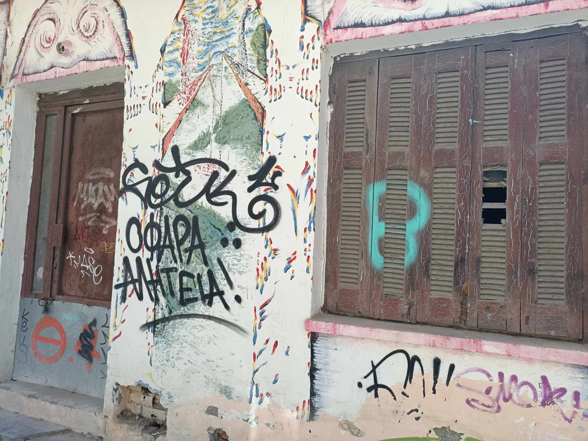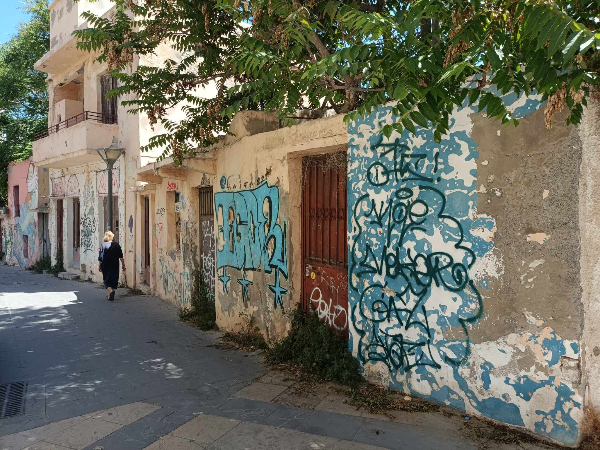 Όμως μια βόλτα στους γύρω δρόμους δείχνει τα χαλάσματα. Γκρεμισμένα και ετοιμόρροπα σπίτια ,με ξεχαρβαλωμένες πόρτες και παράθυρα και με τα ξεθωριασμένα γκράφιτι του lakkos project που υλοποιήθηκε πριν από μερικά χρόνια.