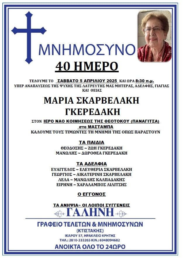 Το Σάββατο στις 8.30 το πρωί στον Ιερό Ναό Κοιμήσεως της Θεοτόκου (Παναγίτσα) στον Μασταμπά, θα τελεστεί το μνημόσυνο της Μαρίας Σκαρβελάκη – Γκερεδάκη.