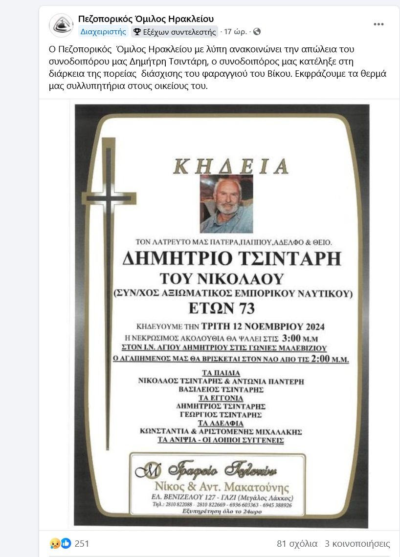 Το τραγικό περιστατικό σημειώθηκε το βράδυ του Σαββάτου, όταν ο 73χρονος έχασε τις αισθήσεις του κατά την διάρκεια πεζοπορίας, λίγο πριν η ομάδα φτάσει στο χωριό Βίκος. Διασώστρια που ήταν μαζί τους, έκανε αμέσως ΚΑΡΠΑ, χωρίς όμως να καταφέρει να τον επαναφέρει στη ζωή.
