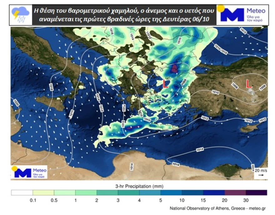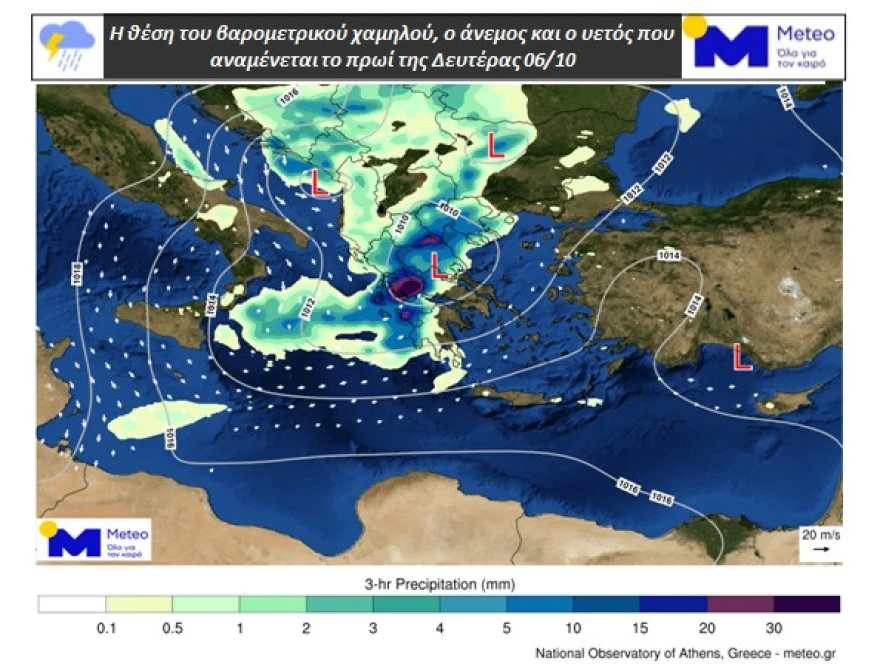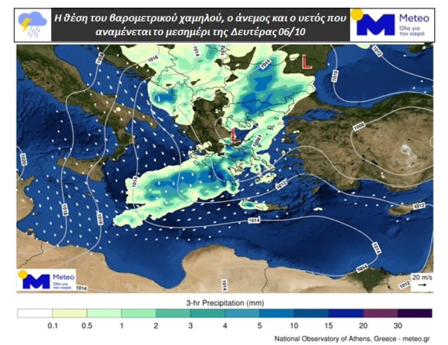 Στους σχετικούς χάρτες παρουσιάζεται η θέση του βαρομετρικού χαμηλού, ο άνεμος κοντά στο έδαφος και ο υετός που αναμένεται το πρωί, το μεσημέρι και τις πρώτες βραδινές ώρες της Δευτέρας (6/10)