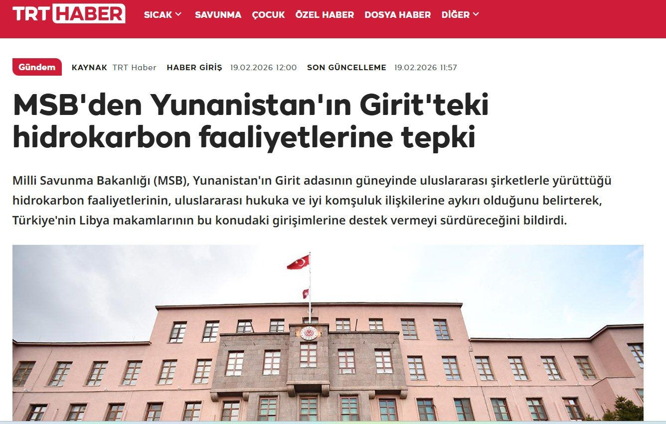 Σύμφωνα με το κρατικό κανάλι της Τουρκίας TRT, το Υπουργείο Εθνικής Άμυνας χαρακτηρίζει τις δραστηριότητες της Ελλάδας για έρευνες υδρογονανθράκων στο νότιο τμήμα της Κρήτης, σε συνεργασία με διεθνείς εταιρείες, ως αντίθετες με το διεθνές δίκαιο και τις σχέσεις καλής γειτονίας, και ότι η Τουρκία θα συνεχίσει να υποστηρίζει τις πρωτοβουλίες των λιβυκών αρχών σε αυτό το θέμα.