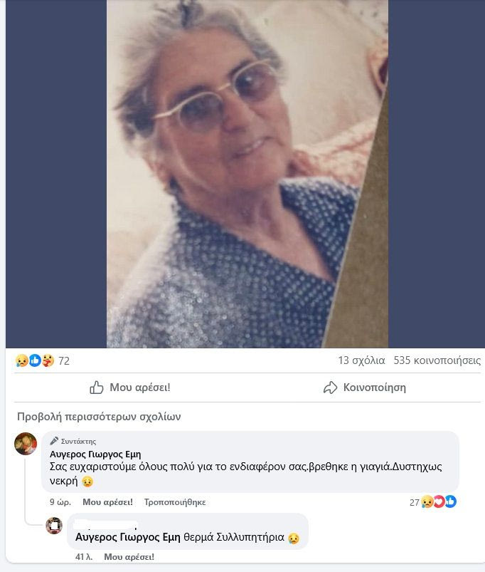 Τραγική κατάληξη είχαν δυστυχώς οι έρευνες για την 95χρονη Χανιώτισσα τα ίχνη της οποίας είχαν χαθεί το πρωί της Κυριακής 24/8.