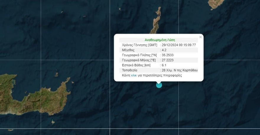 Σύμφωνα με το Γεωδυναμικό Ινστιτούτο η δόνηση καταγράφηκε στα 28 χιλιόμετρα νότια της Καρπάθου, ενώ το εστιακό βάθος ήταν στα 6,1 χιλιόμετρα.