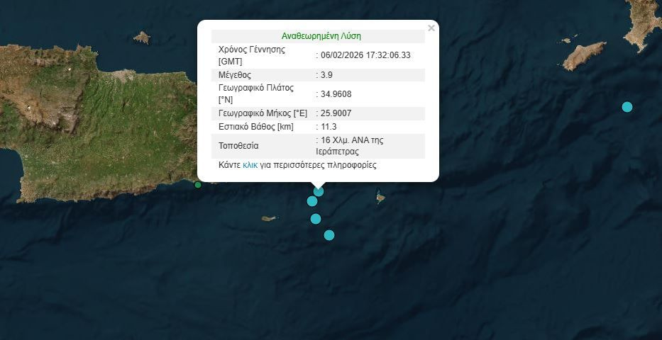 Ο δεύτερος σεισμός είχε εστιακό βάθος 11,3 χιλιόμετρα και επίκεντρο 16χλμ ανατολικά – νοτιοανατολικά της Ιεράπετρας.