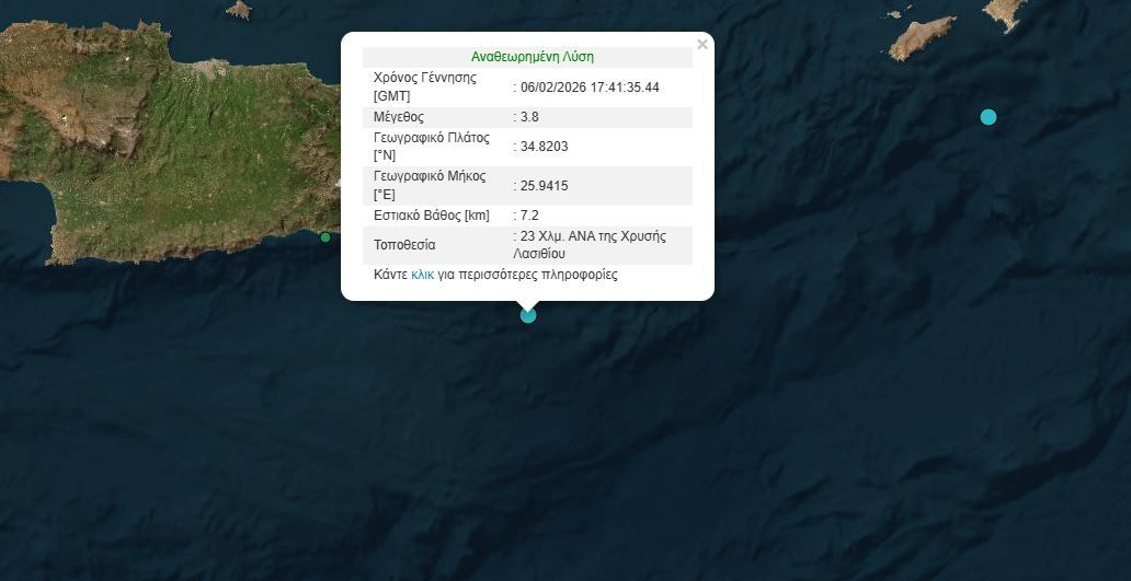 Εννέα λεπτά αργότερα ακολούθησε και τρίτος σεισμός μεγέθους 3,8 Ρίχτερ και εστιακό βάθος τα 7,2 χιλιόμετρα. Το επίκεντρο του σεισμού ήταν 23χιλ ανατολικά της Χρυσής Λασιθίου.