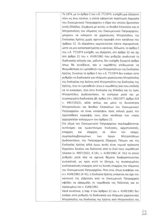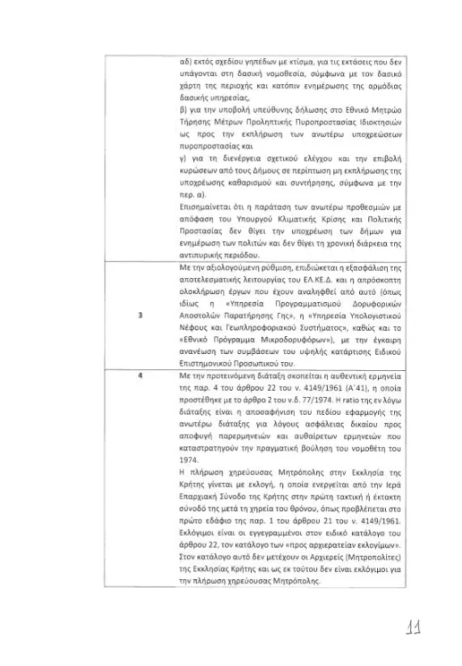 Στο άρθρο τέσσερα «Ερμηνευτική διάταξη για εκλογή Μητροπολιτών στην Εκκλησία Κρήτης», αναφέρεται: «Κατά αληθή έννοια παρ. 4 του άρθρου 22 του ν. 4149/1961 (Α’ 61), Βοηθοί Επίσκοποι και Μητροπολίτες του κλίματος του Οικουμενικού Πατριαρχείου είναι οι Βοηθοί Επίσκοποι και οι εν ενεργεία Μητροπολίτες του κλίματος του Οικουμενικού Πατριαρχείου που εδρεύουν Εκτός Ελλάδος και έχουν τα προσόντα παρ. 2 του άρθρου 22.
