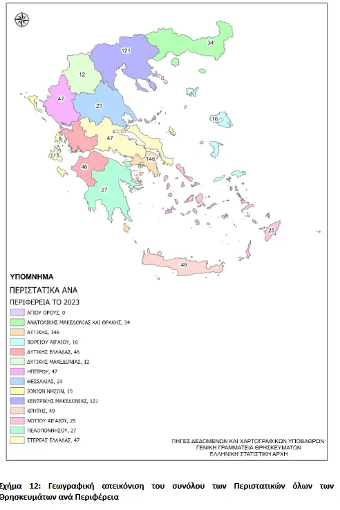 Τα περιστατικά εις βάρος χώρων θρησκευτικής σημασίας στην Ελλάδα που έλαβαν χώρα κατά το έτος 2023 και την γεωγραφική τους κατανομή, έδωσε το Τμήμα Θρησκευτικών Ελευθεριών και Διαθρησκευτικών Σχέσεων της Διεύθυνσης Θρησκευτικής Εκπαίδευσης και Διαθρησκευτικών Σχέσεων της Γενικής Γραμματείας Θρησκευμάτων.