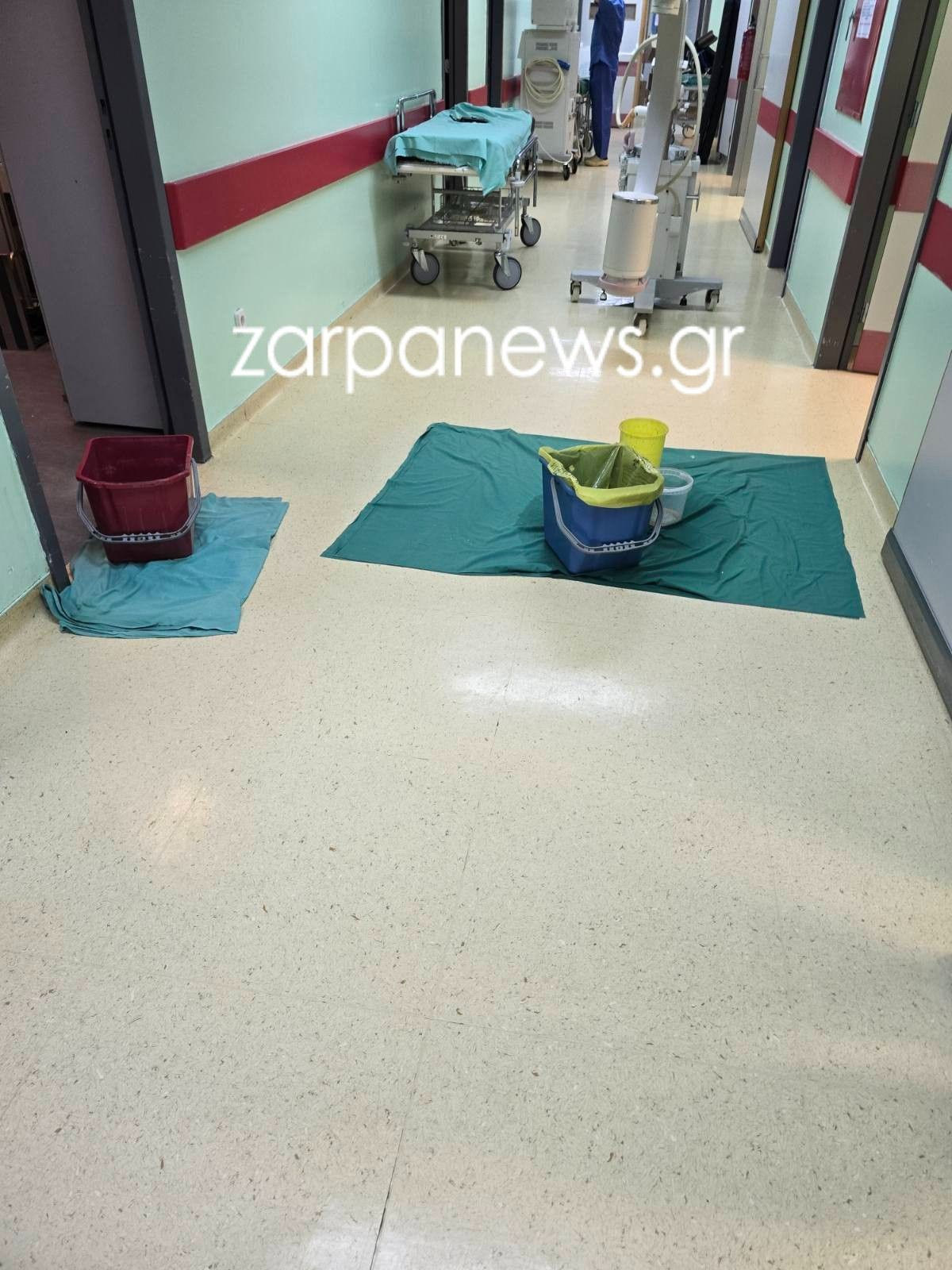 Κουβάδες, λεκάνες, αυτοσχέδια χαλιά και ακόμα και είδη ιματισμού του νοσοκομείου χρησιμοποιούνται για να συγκρατήσουν το νερό που προέρχεται από το σύστημα κλιματισμού – εξαερισμού.