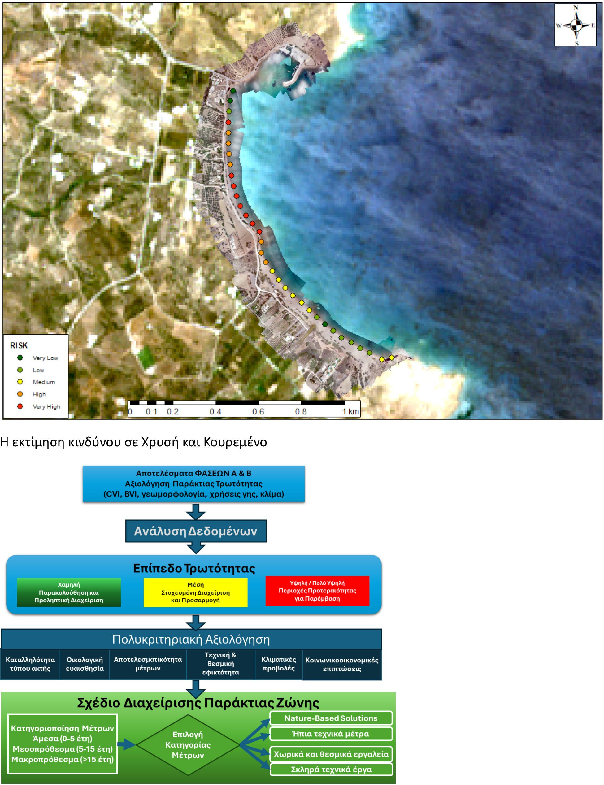 Στην Κρήτη, τα αποτελέσματα ανέδειξαν σημαντικές χωρικές διαφοροποιήσεις. Η περιοχή του Κουρεμένου στη Σητεία παρουσιάζει μέση έως υψηλή τρωτότητα, κυρίως λόγω της έκθεσης σε βορειοανατολικούς κυματισμούς. Αντίθετα, η Νήσος Χρυσή καταγράφεται ως μία από τις πιο ευάλωτες περιοχές, με πολύ υψηλή τρωτότητα, λόγω χαμηλού ανάγλυφου, εκτεταμένων αμμωδών σχηματισμών και έντονης αύξησης της κυματικής ενέργειας.