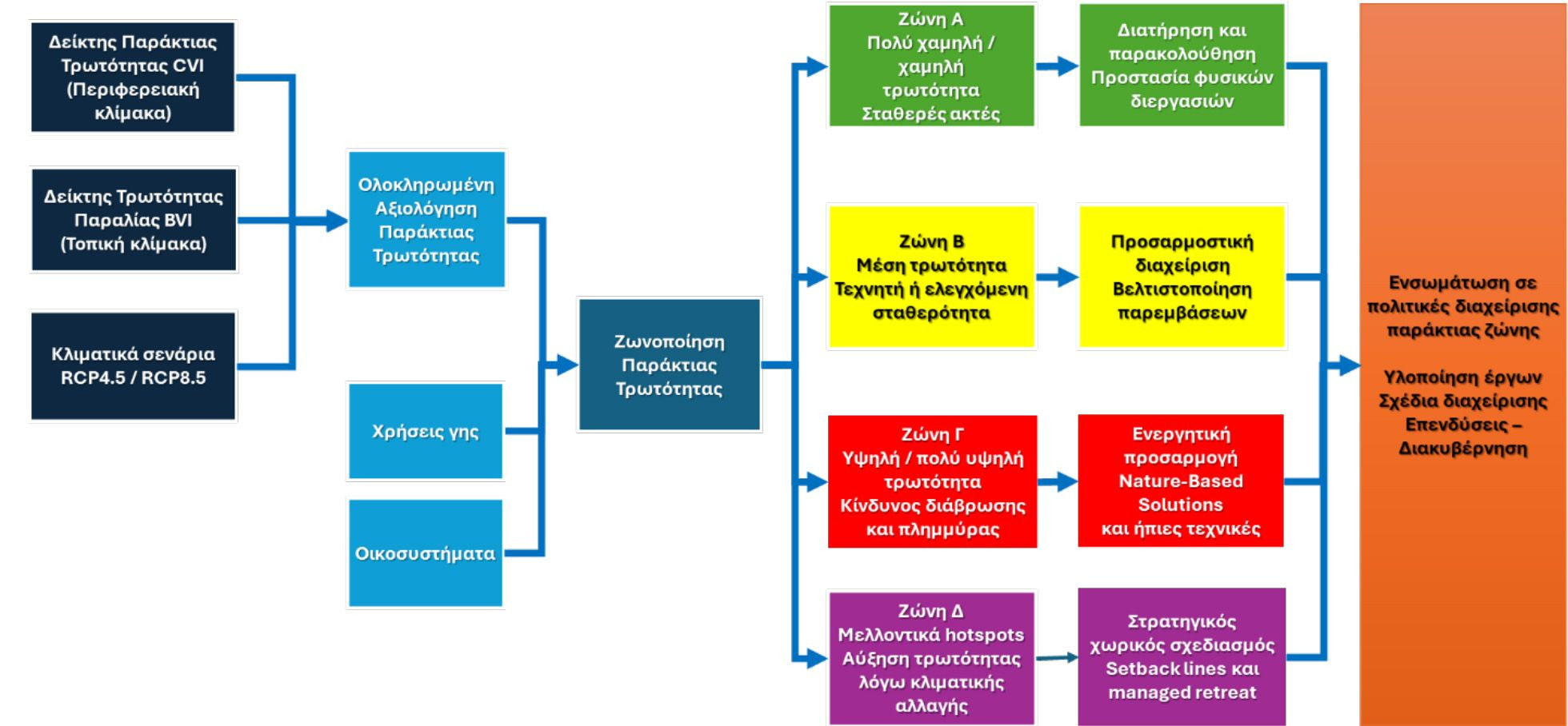 Καινοτομικό στοιχείο της προσέγγισης αποτελεί η ζωνοποίηση της παράκτιας τρωτότητας. Η ακτογραμμή κατηγοριοποιήθηκε σε τέσσερις διακριτές ζώνες διαχείρισης, οι οποίες αντιστοιχούν σε διαφορετικά επίπεδα κινδύνου και διαφορετικές στρατηγικές παρέμβασης, καθώς και χρονικά επίπεδα παρέμβασης.