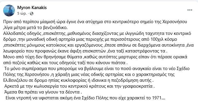 Σοβαρό τροχαίο σημειώθηκε τα ξημερώματα της Δευτέρας στον κεντρικό δρόμο της Χερσονήσου με ένα ΙΧ επιβατικό αυτοκίνητο να συγκρούεται με τουριστικό λεωφορείο και ταξί.